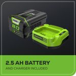 - What’s Included: (1)2.5 Ah Lithium-Ion Battery & Charger
